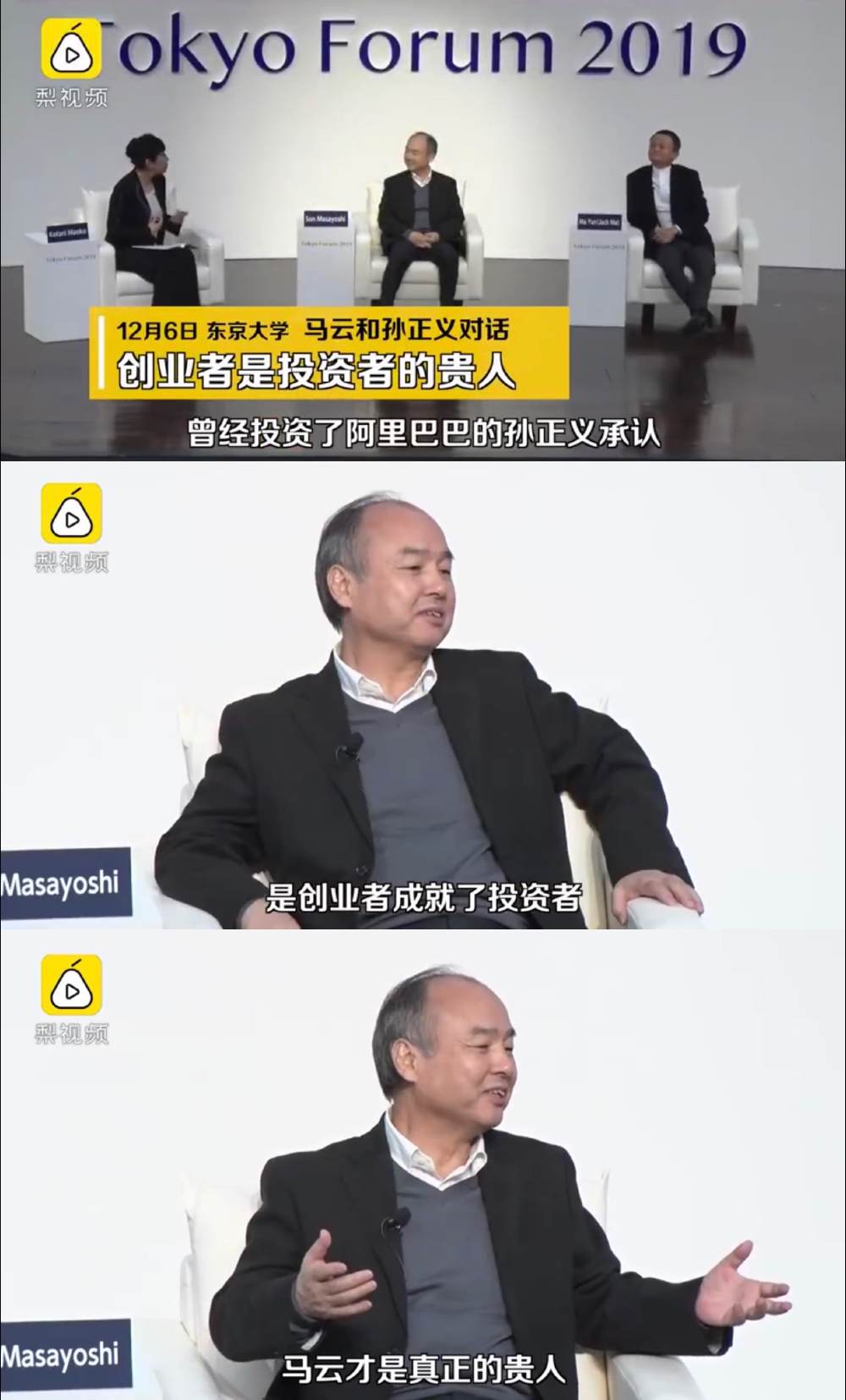 孙正义承认马云是贵人。12月6日,孙正义和马云在东京大学对话,当主持人问马云,孙正义作为投资者是不是某种程度扮演了导师角色,孙正义连忙抢答,摇头否认。孙正义称2000年第一次见到马云,5分钟就被打动,坚信阿里巴巴会成功。他称赞马云关心人类,识人善用,从马云身上学到很多。