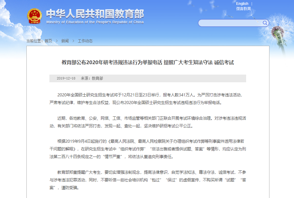 341万人报名2020年研考,考研报名人数创新高。12月18日,据教育部官网,2020年全国硕士研究生招生考试将于12月21日至23日举行,报考人数341万人。2018年研究生报考人数为238万,2019年研究生报考人数达290万人,2020年研究生考试报名人数再创历史新高。