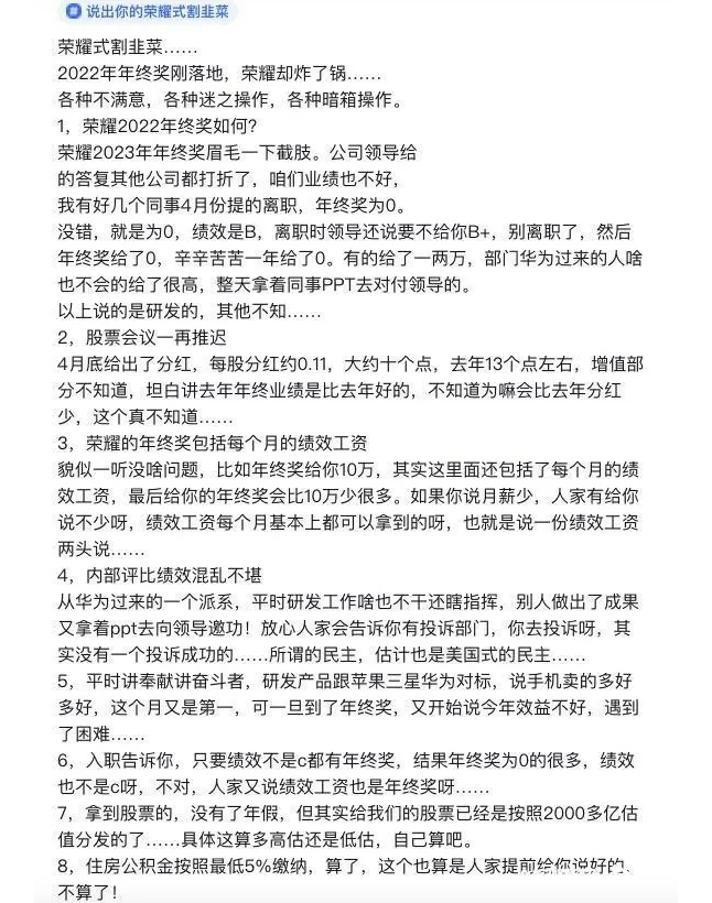 据南都湾财社,记者日前在职言平台看到,有网友爆料称,荣耀个别部门2022年年终奖大幅缩水,甚至出现“打骨折”的情况,此外股票会议也在推迟。相关发帖下,有多位实名认证为荣耀员工的账号表示情况基本属实。
