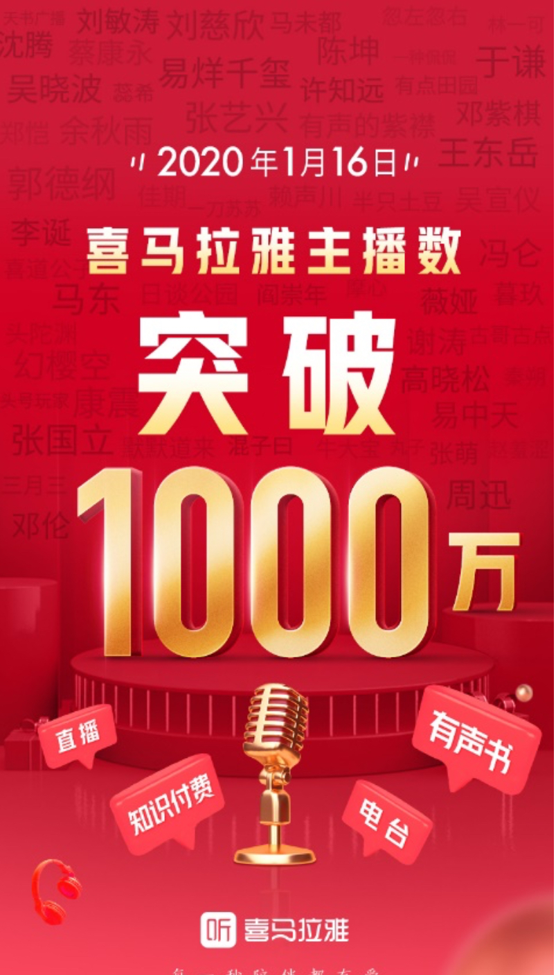 1月16日,音频分享平台喜马拉雅称,旗下平台主播已经突破1000万。据了解,2019年全年,通过“万人十亿计划”,喜马拉雅共计为主播贡献了16.34亿现金分成。