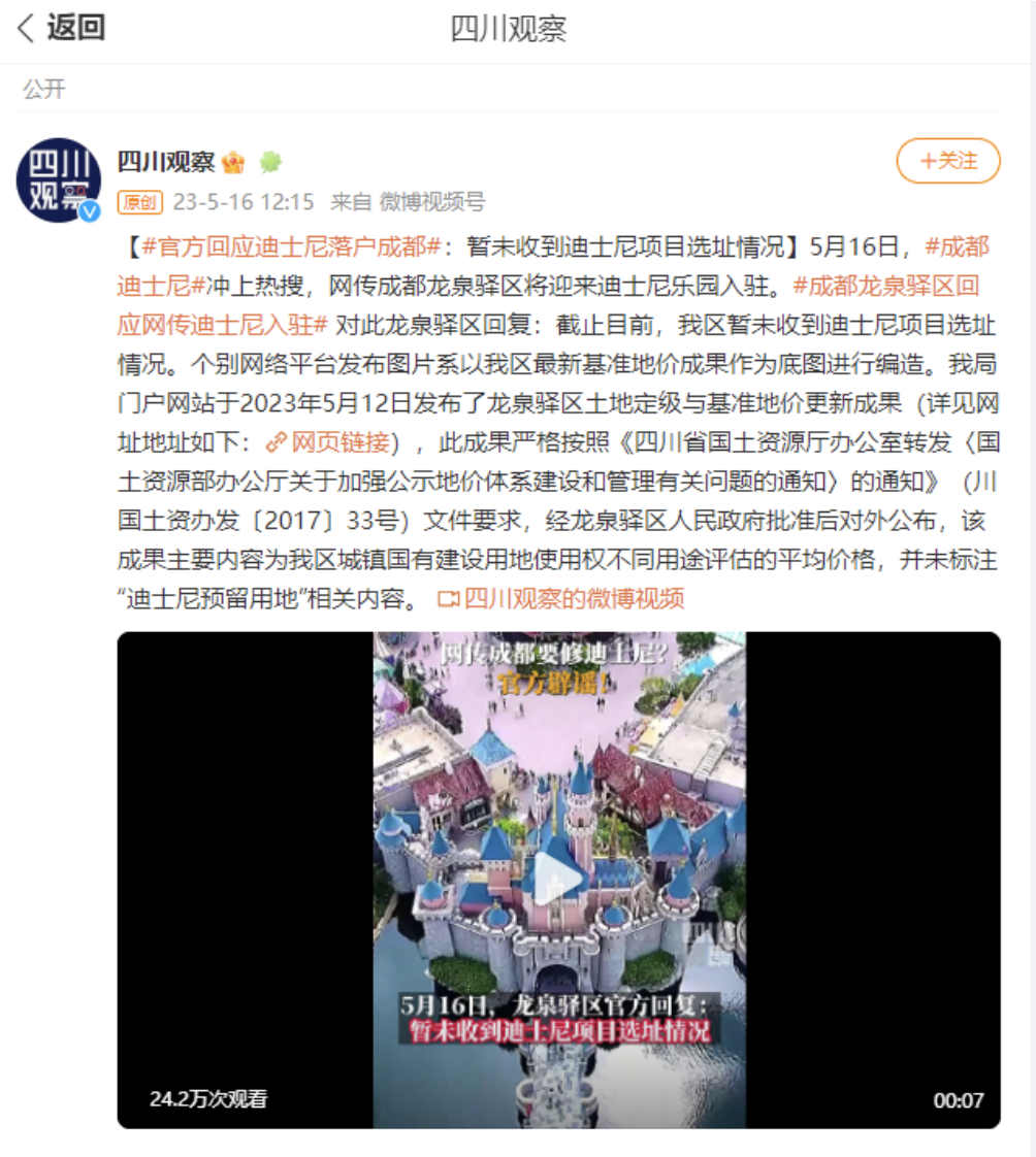 据四川观察微博,5月16日,“成都 迪士尼”冲上热搜,网传成都龙泉驿区将迎来迪士尼乐园入驻。