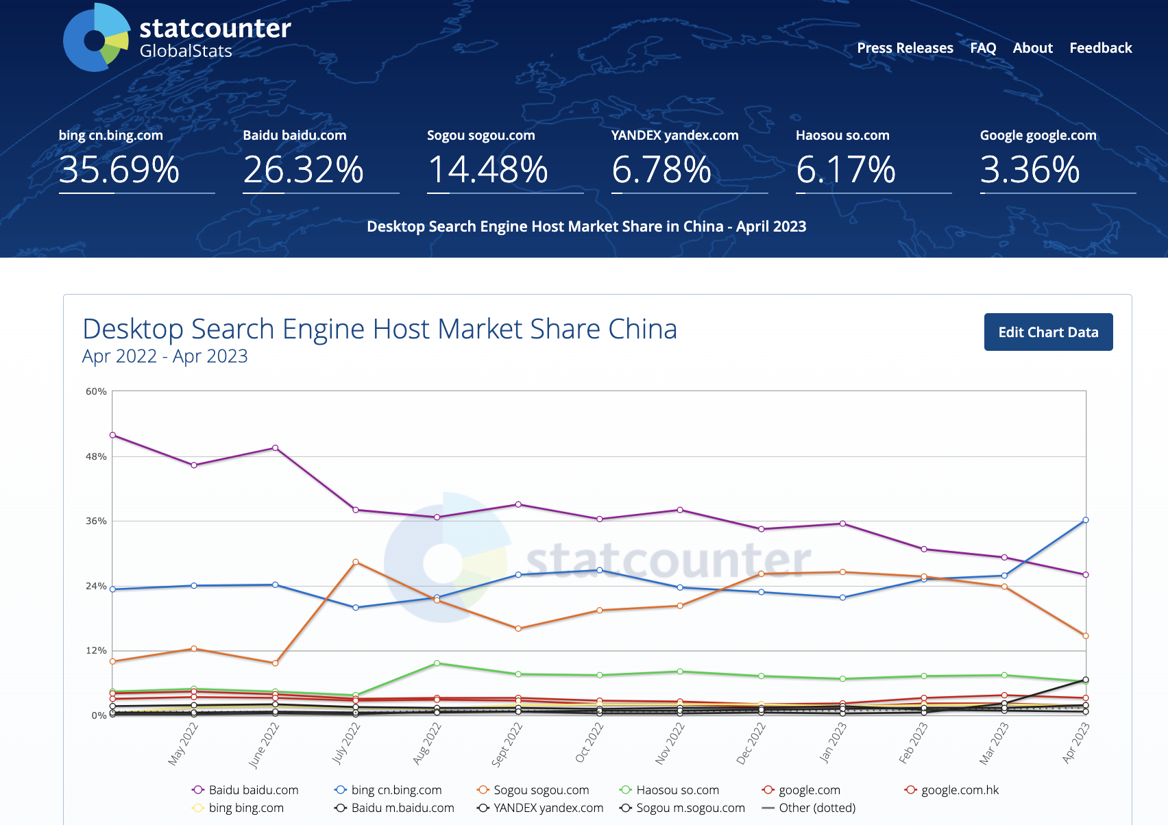 数据显示百度失去中国第一大桌面搜索引擎宝座。5月22日消息,StatCounter的数据显示,在中国内地桌面搜索市场上,到2023年4月,微软必应的份额再次创出历史新高,达到了37.4%,取代百度成为中国第一大桌面搜索引擎。截止发稿,百度的份额为26.32%。微软必应、搜狗、Yandex、好搜、谷歌的市场份额为35.69%、14.48%、6.78%、6.17%、3.36%。 据了解,StatCounter是一个网站流量分析工具,主要提供网页浏览器的使用分布的讯息。