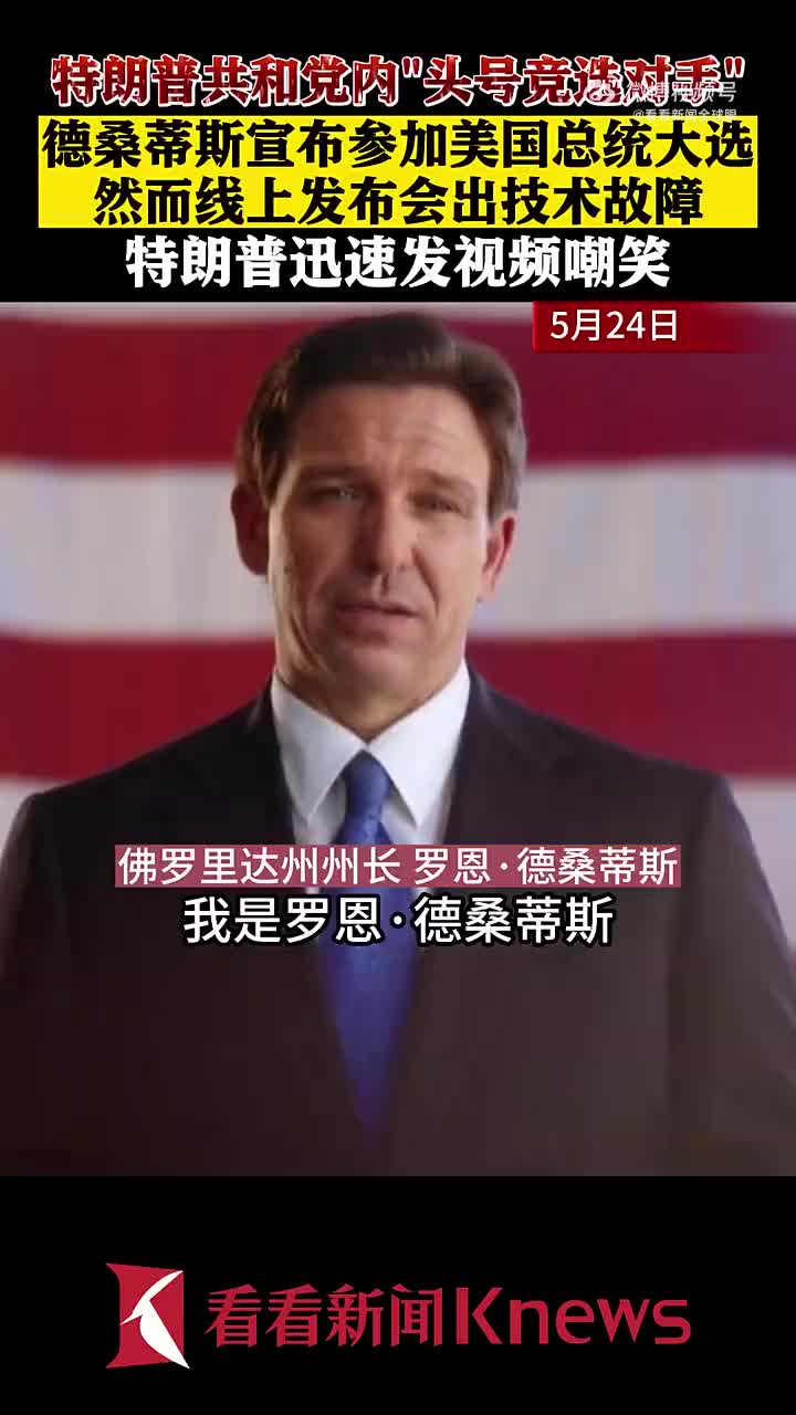 德桑蒂斯宣布参选直播出故障,特朗普发视频嘲笑。美国佛罗里达州州长罗恩·德桑蒂斯当地时间5月24日宣布将参加2024美国大选,他将成为美国前总统特朗普的共和党初选竞争对手。据美媒报道,德桑蒂斯在推特上的线上发布会受到技术故障干扰,特朗普迅速在社交媒体上发帖嘲讽,称发布会是一场“灾难”,并发布了一段写有“罗恩2024”火箭发射失败的短视频。(via 看看新闻全球眼)
