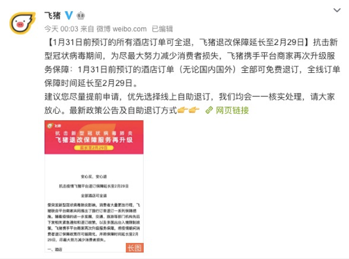 飞猪再次发布疫情期间退改新政:2月29日前全球酒店全部可免费退订。2月3日凌晨,飞猪再次升级新型冠状病毒肺炎期间旅行产品退改保障政策,所有1月31日(含)之前预订、且出行时间为1月23日至2月29日的酒店订单,无论国内国外,一律提供免费退订保障。这也是目前旅游业内时间覆盖最长、地域覆盖范围最广的酒店退改保障政策。