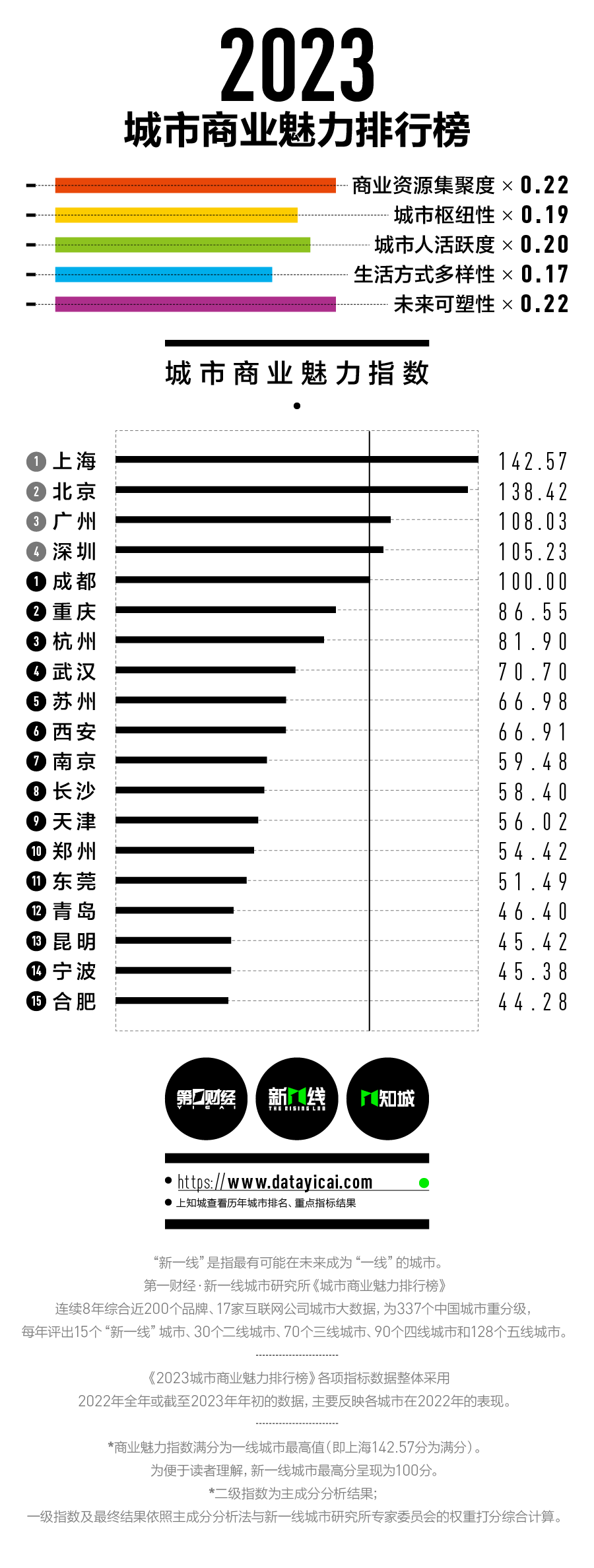 2023新一线城市名单官宣:昆明回归,青岛上升,北方城市仅占四席。据第一财经,新一线城市研究所的《城市商业魅力排行榜》也已经连续发布到第8年。通过近200个品牌、17家互联网公司和数据机构的城市大数据,围绕商业资源集聚度、城市枢纽性、城市人活跃度、生活方式多样性和未来可塑性五大一级维度来评估337座地级及以上城市,2023年这份榜单里的15座新一线城市依次是成都、重庆、杭州、武汉、苏州、西安、南京、长沙、天津、郑州、东莞、青岛、昆明、宁波、合肥。