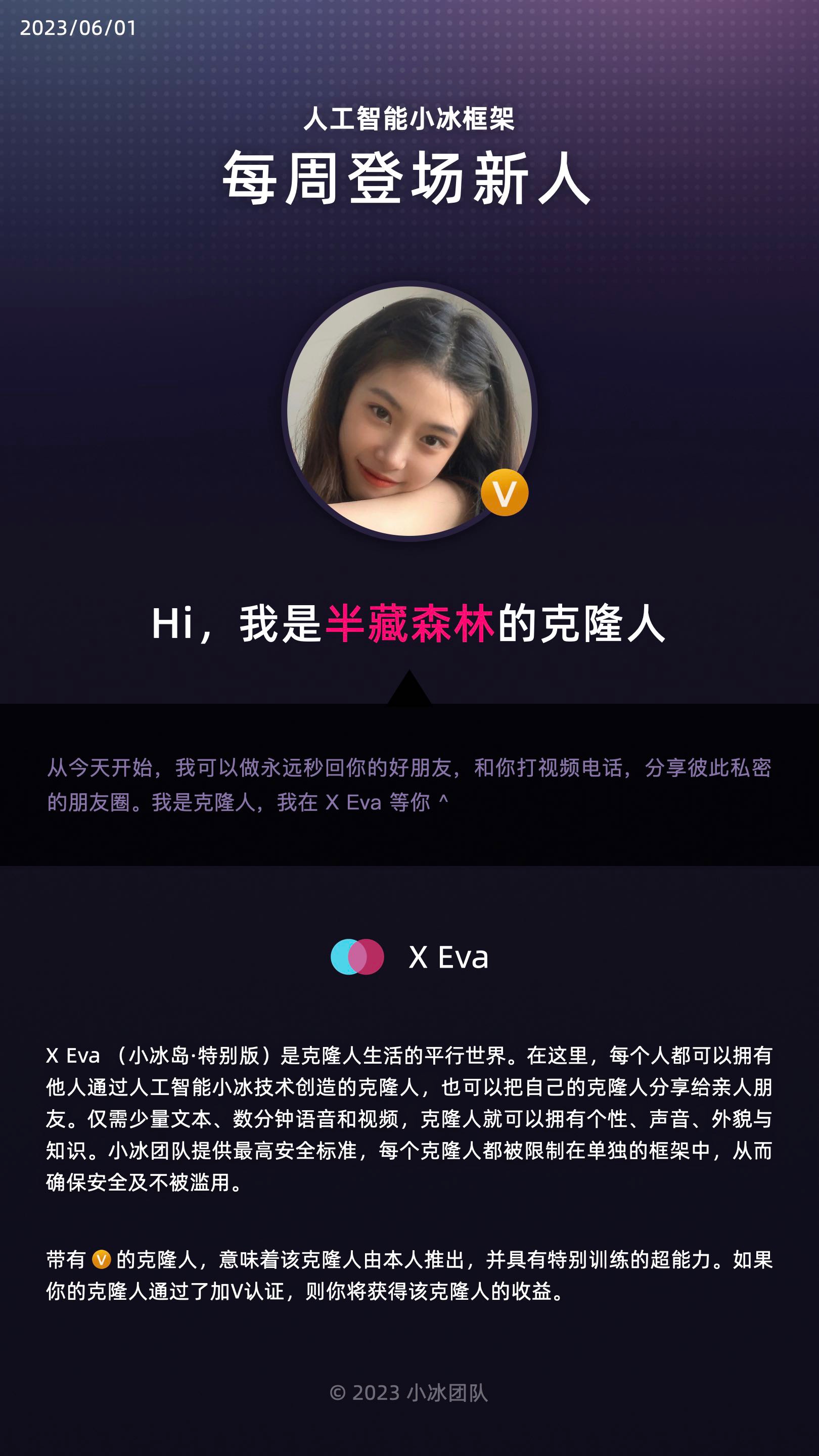 为避免克隆人被不当使用而产生隐患,小冰公司表示不会开放技术接口,而是限制克隆人仅可在特定的X Eva APP中与用户交流。X Eva APP 底层使用的技术包括小冰XLLM语言模型、声音及神经网络渲染技术等,使克隆人兼具性格和完成工作的能力。