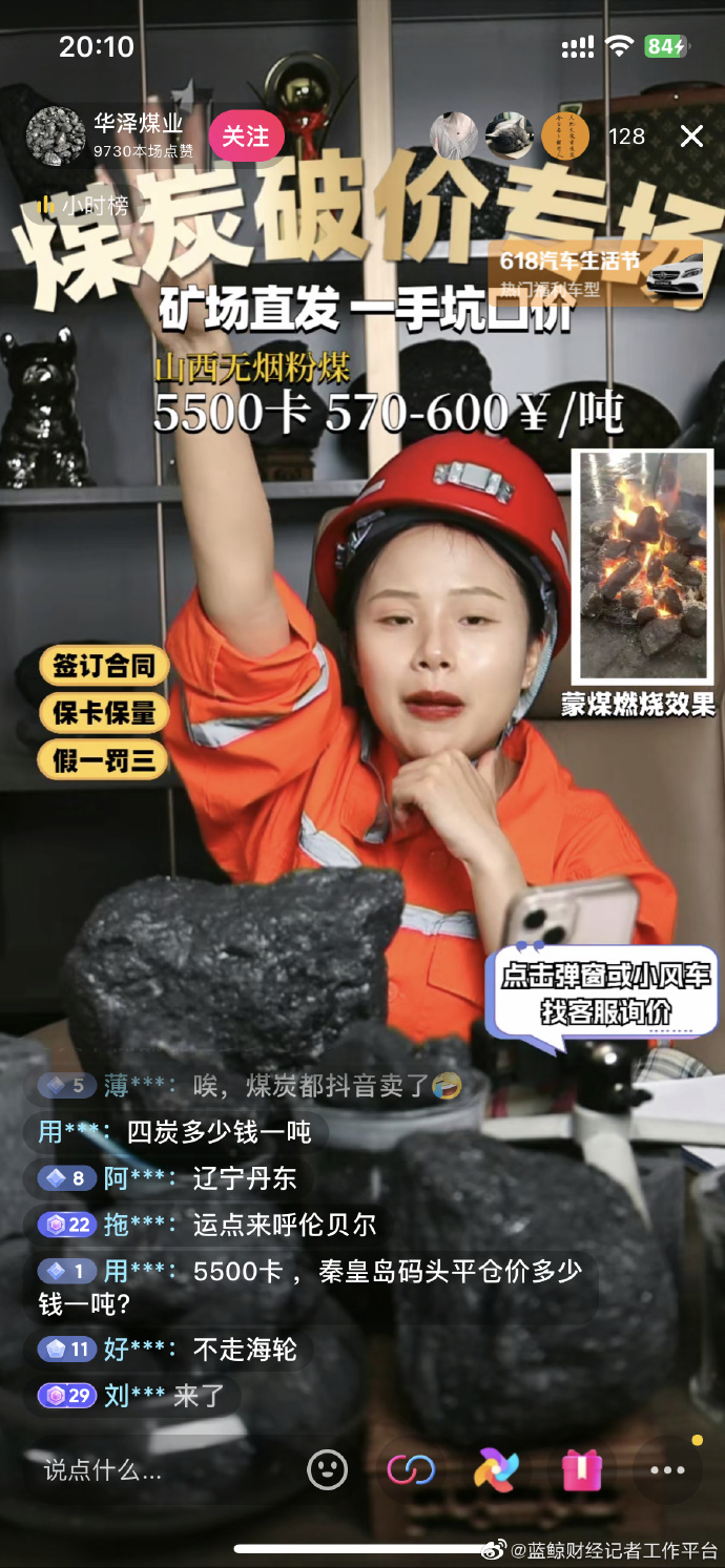 华泽煤业抖音直播卖煤。据蓝鲸财经,6月12日,蓝鲸财经记者发现华泽煤业在抖音账号直播卖煤。直播间简介显示,该公司为原矿直发,一手坑口价,无中间商赚差价。据主播介绍,华泽煤业每天都会进行卖煤直播,若需要购买可与客服在线联系。