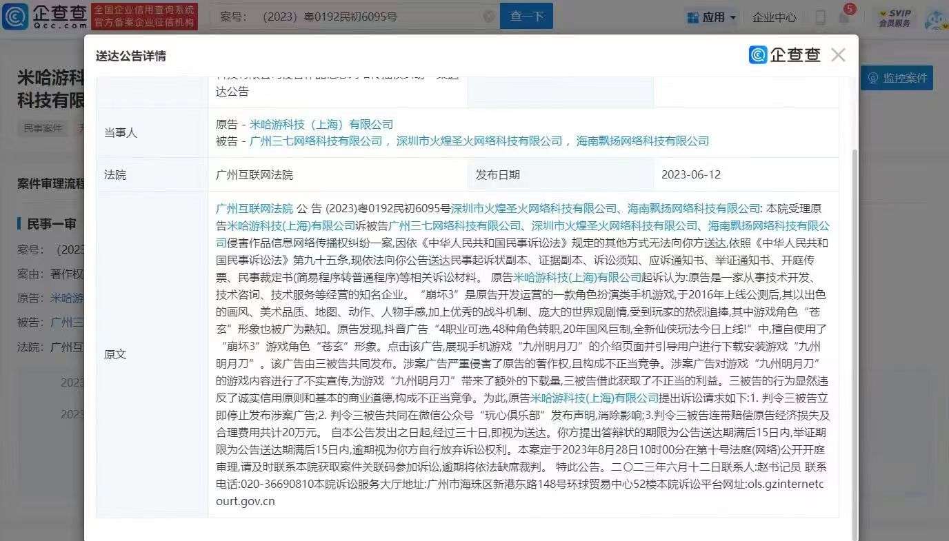 米哈游起诉三七互娱侵权崩坏3。近日,广州互联网法院向深圳市火煌圣火网络科技有限公司、海南飘扬网络科技有限公司公告送达起诉状副本等。公告显示,米哈游科技(上海)有限公司起诉广州三七网络科技有限公司及上述两公司侵害作品信息网络传播权。米哈游公司认为,三被告发布的“九州明月刀”游戏广告中,擅自使用了原告运营的“崩坏3”游戏角色“苍玄”形象,严重侵害了原告的著作权,且构成不正当竞争,请求法院判令三被告立即停止发布涉案广告,发布声明消除影响,并赔偿原告经济损失及合理费用共计20万元。