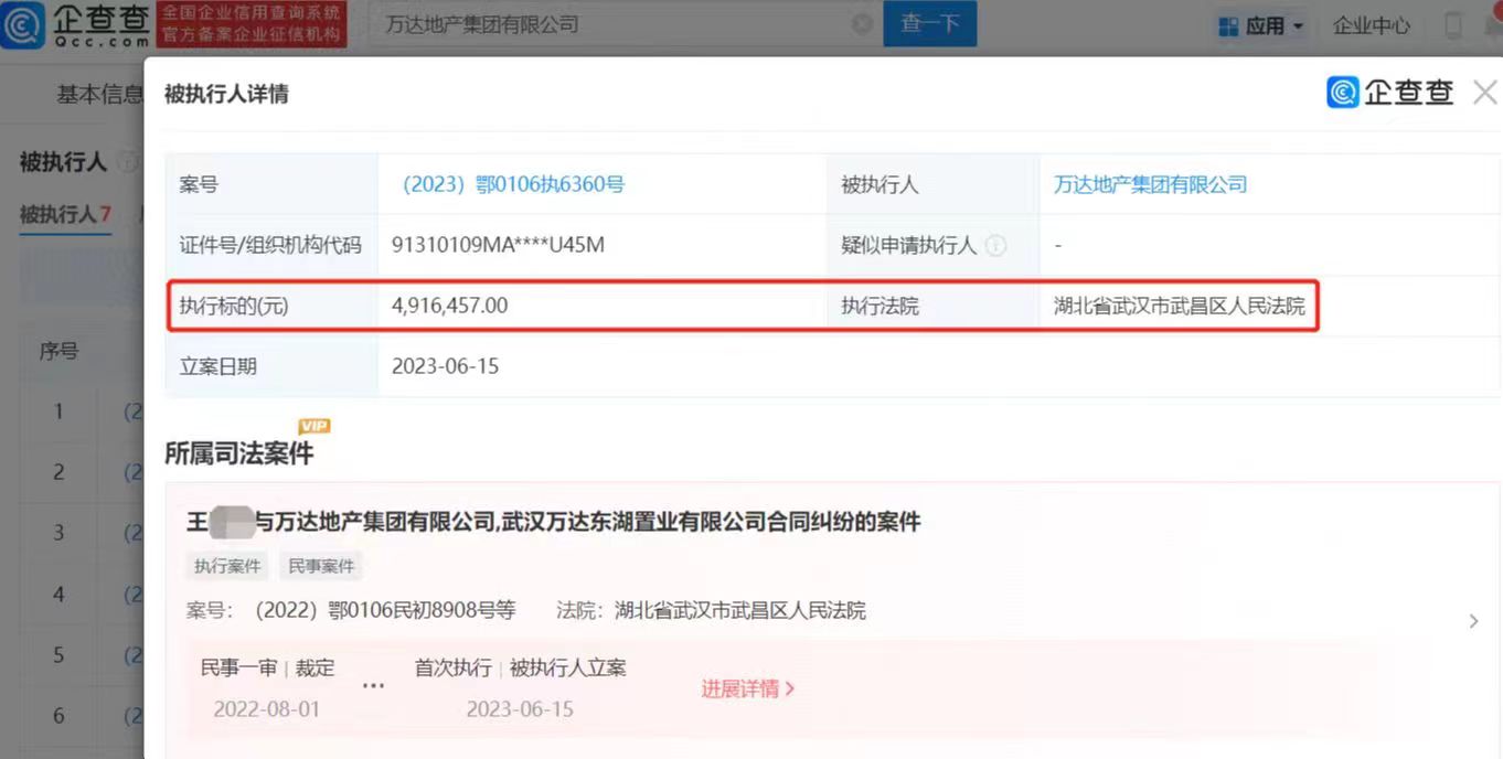 万达地产被强制执行491万。据企查查消息,近日,万达地产集团有限公司新增被执行人信息,执行标的491.65万元,涉及案由为合同纠纷,执行法院为湖北省武汉市武昌区人民法院。截至目前,万达地产集团有限公司已累计被执行约10.93亿元。