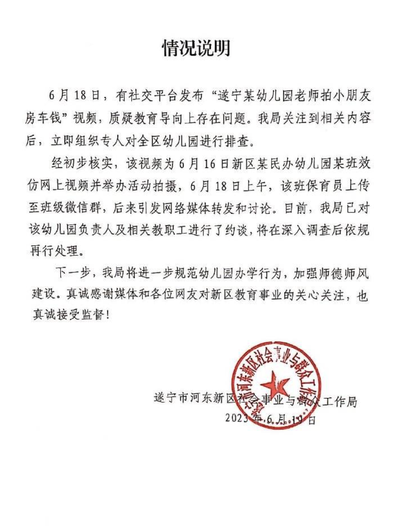 遂宁某幼儿园老师拍小朋友房车钱视频?官方通报:约谈幼儿园负责人。