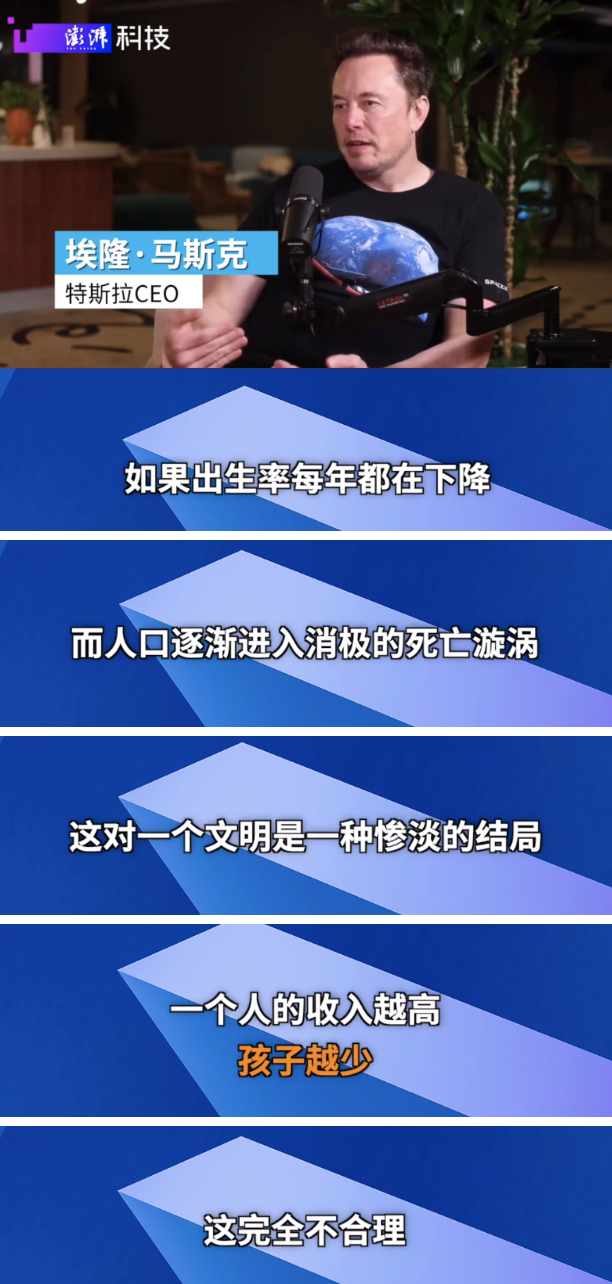 已是9个孩子的爹,马斯克谈“生育率下降”:收入越高孩子越少不合理,有孩子的快乐无法比拟。