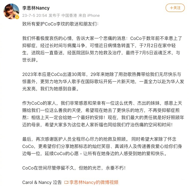 歌手李玟轻生去世,姐姐发声。7月5日,歌手李玟姐姐发文:“CoCo于数年前不幸患上了抑郁症,经过长时间与病魔斗争,可惜近日病情急转直下,于7月2日在家中轻生,送院后一直昏迷,经医院团队努力抢救及治疗,最终于7月5日返魂乏术,与世长辞”。
