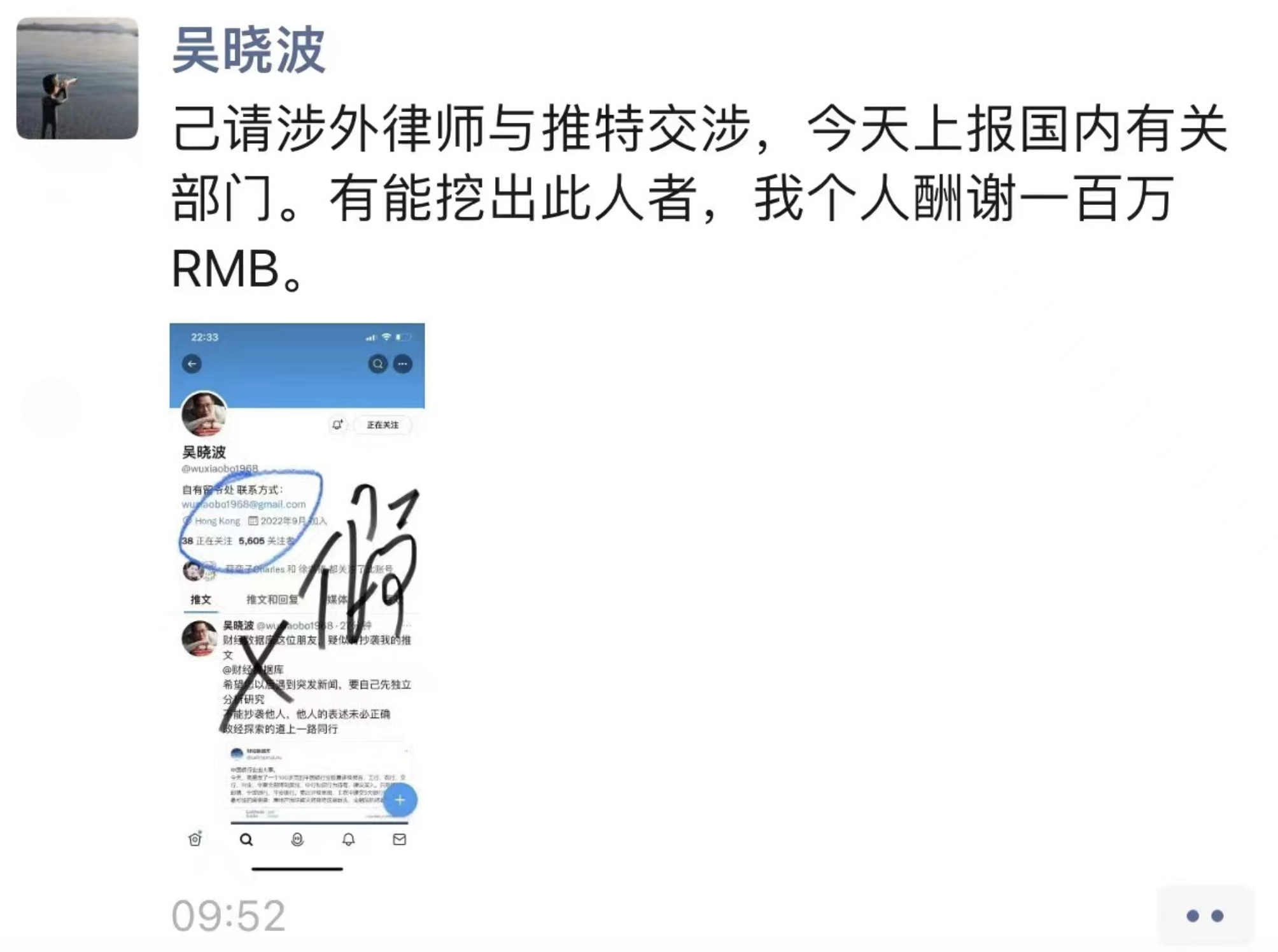 目前,吴晓波称己请涉外律师与推特交涉,今天将上报国内有关部门。有能挖出此人者,个人酬谢一百万。