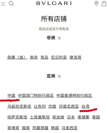 宝格丽官网疑把台湾列为国家。据九派新闻,近日,网传宝格丽官网把中国台湾地区列为了国家,引发网友热议。截至目前,宝格丽暂未做出回应。企查查APP显示,宝格丽国内关联公司为宝格丽商业(上海)有限公司,该公司成立于2006年1月,注册资本为8000万美元,由BULGARI S.P.A.全资控股,其名下还关联一家宝格丽商业(海南)有限公司。