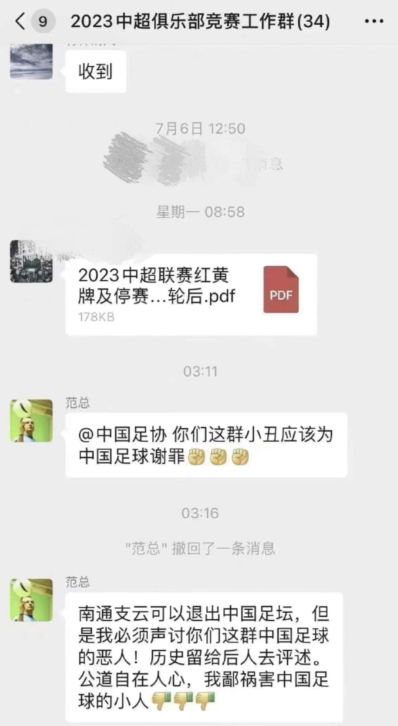 据足球报7月13日消息,在发朋友圈二度炮轰足协后,南通支云老板范兵更是在中超俱乐部竞赛工作群中发声:“@中国足协 你们这群小丑应该为中国足球谢罪,南通支云可以退出中国足坛,但是我必须声讨你们这群中国足球的恶人!历史留给后人去评述,公道自在人心,我鄙祸害中国足球的小人。”