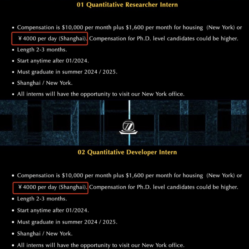 SRC在官方公号上发布了一条全球招聘显示,招聘定量研究员实习生和定量开发实习生。招聘地点为纽约和上海,其中,纽约招聘实习生薪酬为每月1万美元,外加1600美元的住房补贴;在上海的薪酬为每天4000元。此外,博士级别候选人薪酬可能会更高。