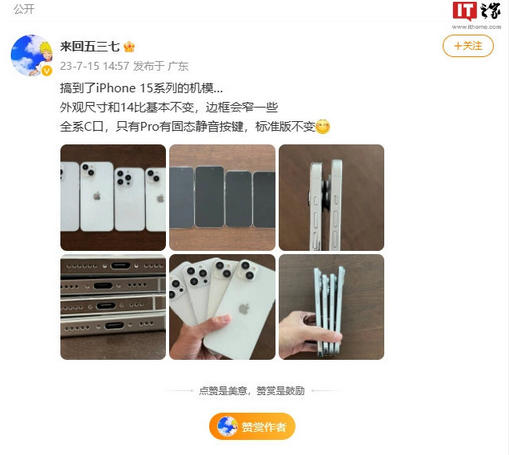 据奇点财经,日前,微博数码博主来回五三七声称自己“搞到了 iPhone 15 系列的模型机”,并展示了一组照片。