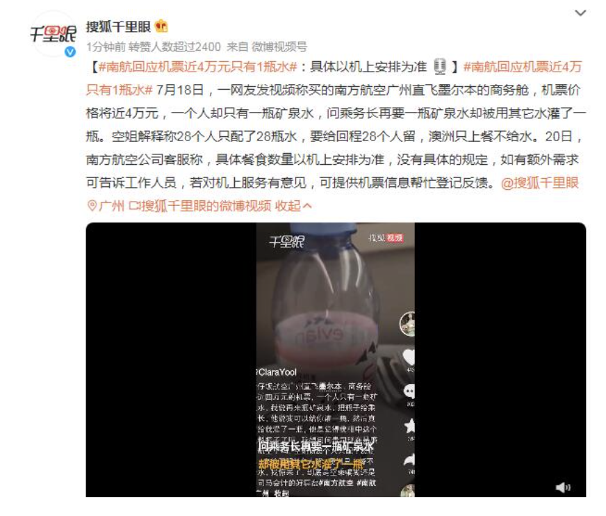 南航回应机票“近4万元只有1瓶水”:以机上的安排为准。