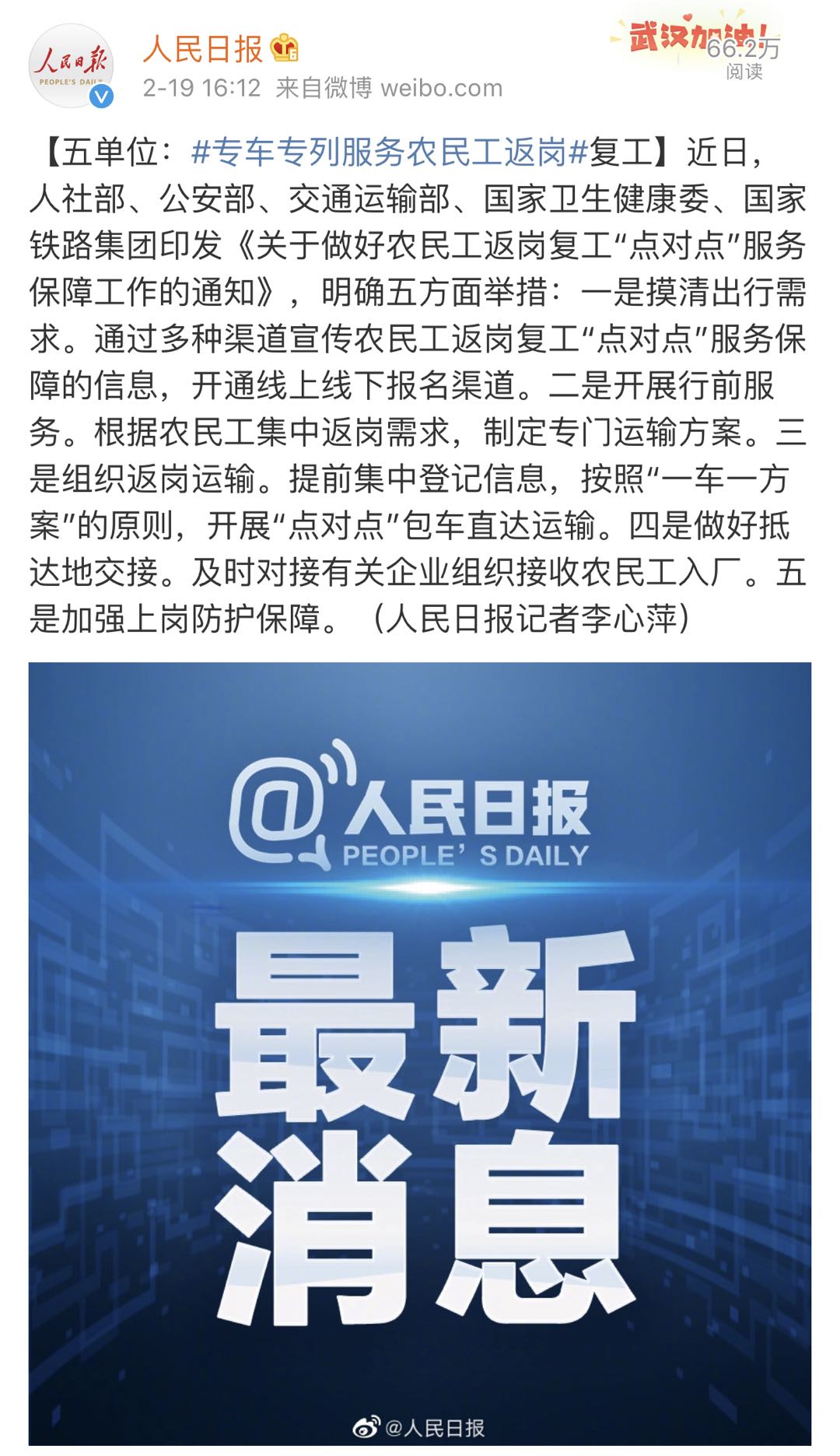 五单位:专车专列服务农民工返岗复工。