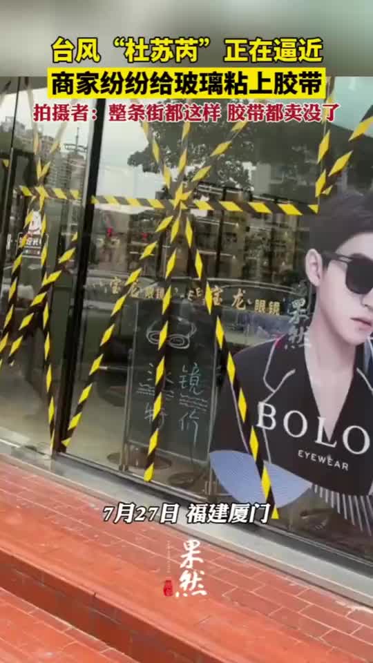 7月27日,随着台风“杜苏芮”逐渐逼近,福建厦门商家纷纷给门窗玻璃粘上胶带,拍摄者:整条街都这样,胶带都卖完了,大家都怕了。(via 齐鲁晚报网)