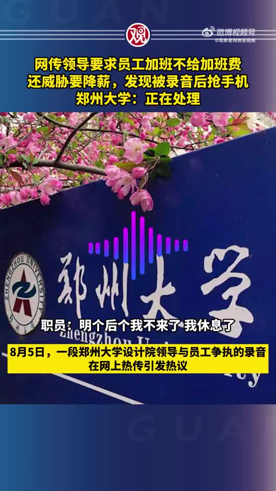 网传郑州大学一领导要求员工无偿加班还威胁降薪,发现被录音后抢手机,郑州大学:正在处理。8月5日,一段郑州大学设计院领导与员工争执的录音在网上热传引发热议,录音中,一名男性员工要求周末按照劳动法正常休息,但一位女性领导表示拒绝,并声称可以休息,但还威胁会进一步给他降薪。6日,郑州大学党委宣传部回应称,有负责的老师在联系了解,具体情况暂不清楚。(via 观察者网微丢视频)