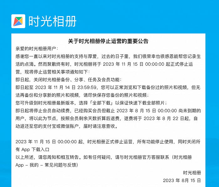 智能云相册APP时光相册将于11月15日停止运营。8月20日消息,智能云相册APP时光相册近日发布公告称,将在今年11月15日正式停止运营。自发布公告之日起,时光相册关闭备份、分享、任务及会员功能。11月14日23:59:59之前,用户可以正常浏览和下载备份过的照片和视频,但无法再备份和分享新的照片和视频。