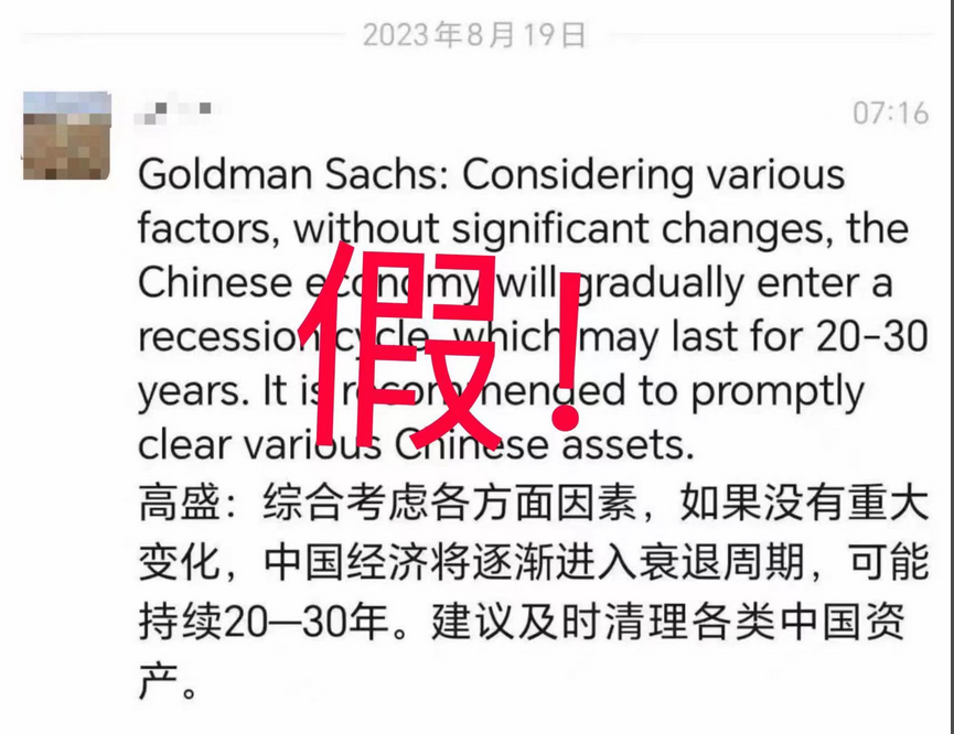 据财联社,今日,一则“高盛称中国经济将逐渐进入衰退周期,建议及时清理各类中国资产。”截图在社交平台广泛传播,记者多方核实,该消息不实。