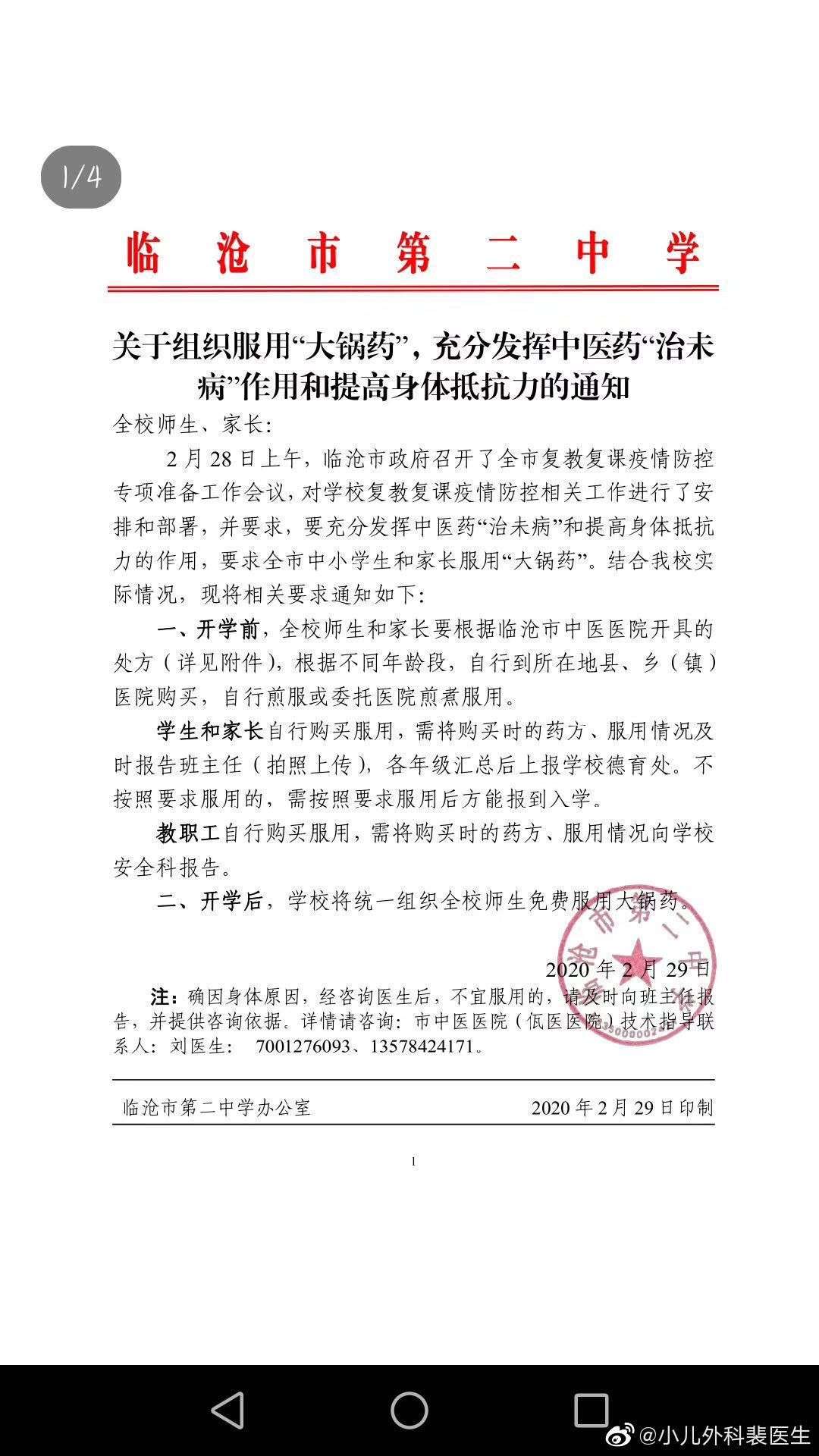 2月29日,云南临沧市第二中学发布了一则《关于组织服用“大锅药”,充分发挥中医药“治未病”作用和提高身体抵抗力的通知》。