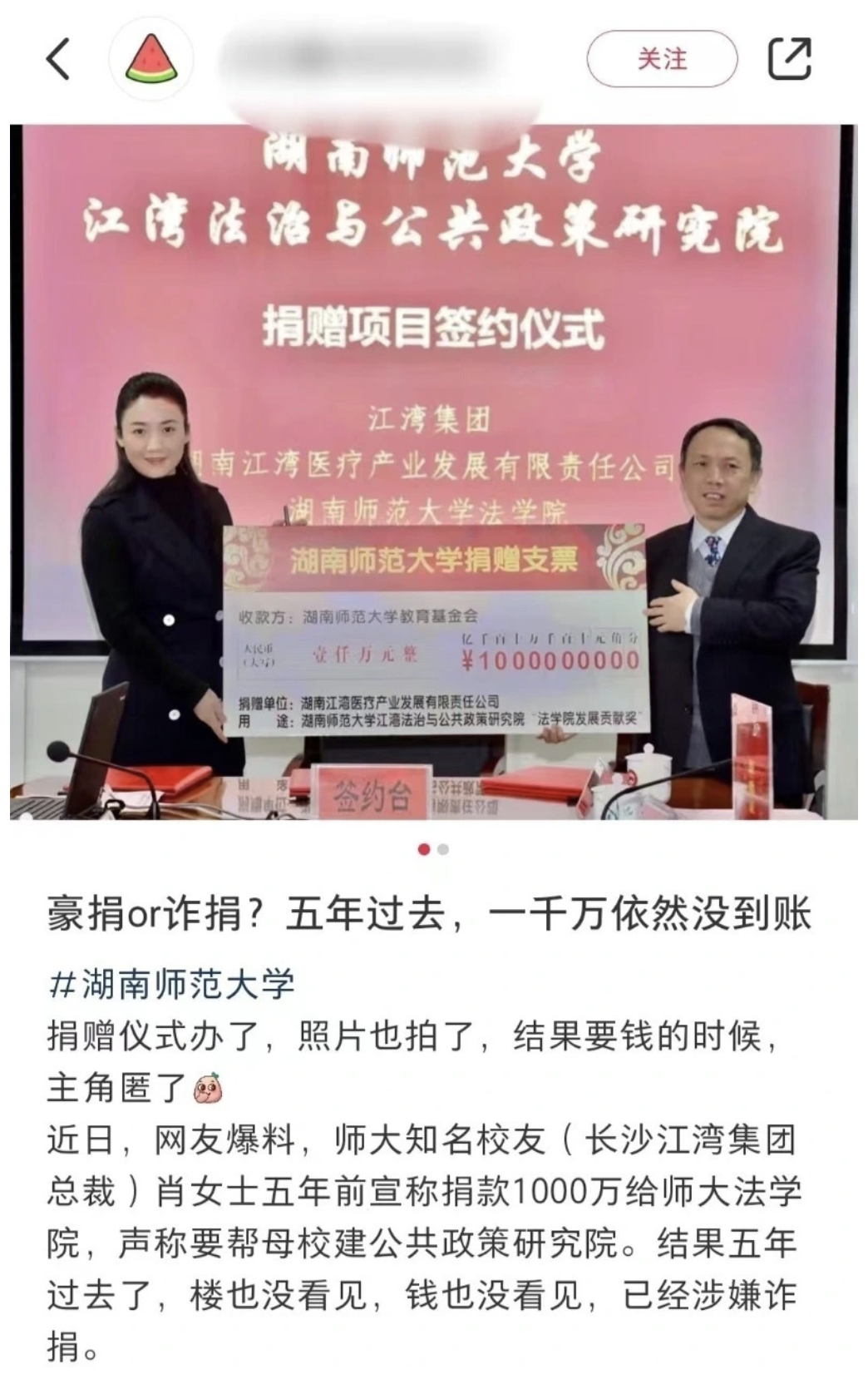 据大皖新闻,9月3日傍晚,有湖南网友爆料称,湖南师范大学知名校友长沙江湾集团总裁肖女士在五年前宣称捐款1000万给师大法学院,帮助母校建设公共政策研究院,但如今,五年过去,一千万依然没到账,是豪捐or诈捐?此消息一出,引发关注。