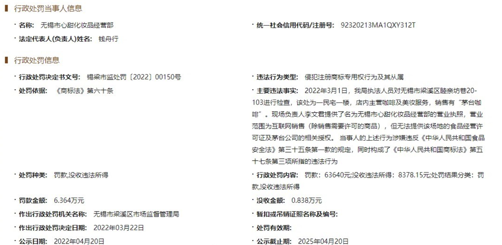 中新财经注意到,2022年,无锡市锡山区市场监督管理局公布的典型案例显示,某餐厅因售卖标注“茅台拿铁”及茅台商标的咖啡杯而被处罚。同年,无锡市心甜化妆品经营部在未领取食品经营许可的情况下销售“茅台咖啡”,且在店内设置“专属特调茅台咖啡 53°¥128”“咖啡天花板玖号 53°飞天茅咖”等宣传牌,被无锡市梁溪区市场监督管理局没收违法所得8378.15元,并处以罚款63640元。