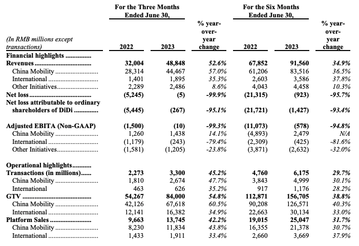 滴滴出行二季度总营收488亿元,同比增长52.6%。9月9日,滴滴出行在官网公布2023年第二季度业绩报告:总营收为488亿元,同比增长52.6%;归属于滴滴普通股股东的净亏损为2.67亿元,较上年同期的净亏损54.45亿元收窄95.1%;非美国通用会计准则下,经调整息税折旧及摊销前利润(EBITA)为亏损1000万元。