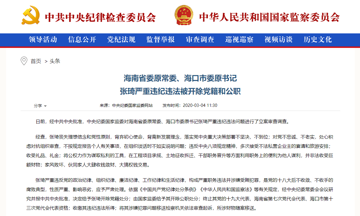 日前,经中共中央批准,中央纪委国家监委对海南省委原常委、海口市委原书记张琦严重违纪违法问题进行了立案审查调查。