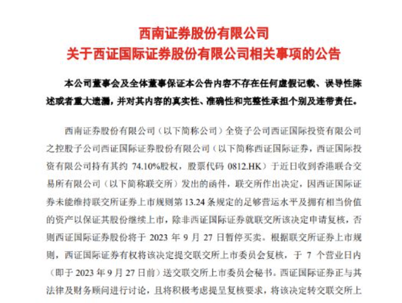 据北京商报,又一家在港中资券商敲响退市警钟。9月18日,西南证券发布公告称,旗下全资子公司的控股子公司西证国际证券股份有限公司因未能维持香港联合交易所有限公司=证券上市规则规定的足够营运水平等因素,或将于9月27日暂停买卖。