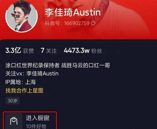 网传截图显示,此前李佳琦抖音账号主页上,显示黄V认证为抖音人气好物推荐官,当时粉丝为3475万。在粉丝4473万时,黄V认证已去掉,但不清楚究竟是何时去掉的,此时橱窗显示有10件好物。9月19日的截图显示,商品橱窗为0,黄V认证无,粉丝为4226.2万。