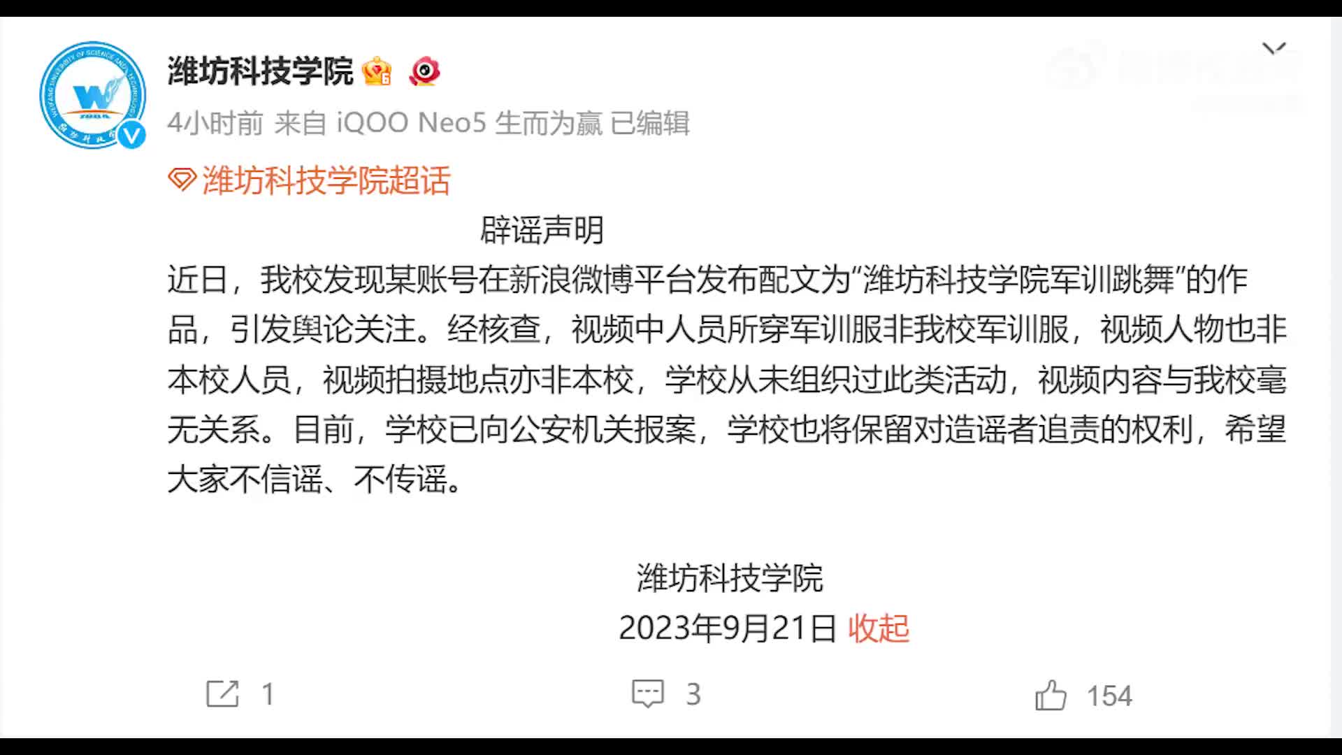 潍坊科技学院辟谣军训跳舞走光视频:非本校活动,已报警。9月21日,针对网传“军训跳舞走光”视频,潍坊科技学院辟谣并发布声明:经查,视频中人物非本校人员,学校从未组织过此类活动。目前,学校已向公安机关报案。(via 澎湃新闻)
