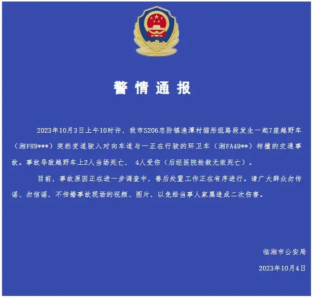 警方通报湖南婚车事故致6死。据临湘公安通报:2023年10月3日上午10时许,我市S206忠防镇渔潭村猫形组路段发生一起7座越野车(湘F89***)突然变道驶入对向车道与一正在行驶的环卫车(湘FA49**)相撞的交通事故。事故导致越野车上2人当场死亡, 4人受伤(后经医院抢救无效死亡)。目前,事故原因正在进一步调查中,善后处置工作正在有序进行。请广大群众勿传谣、勿信谣,不传播事故现场的视频、图片,以免给当事人家属造成二次伤害。
