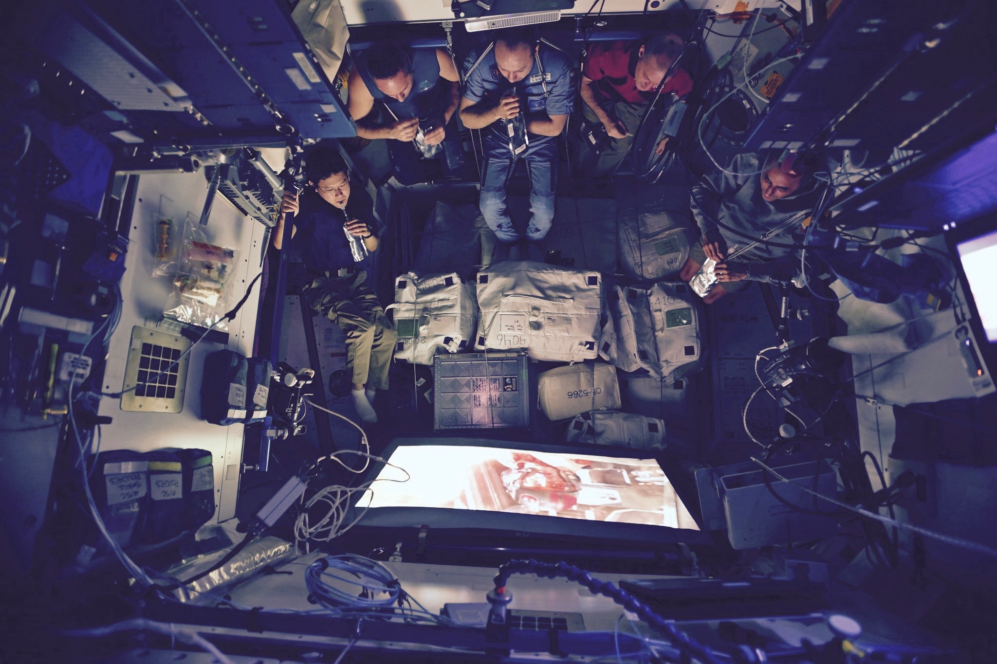 我们在电影院里想象空间站,他们在太空里想象电影院。不知道宇航员们昨晚看的是哪部片。