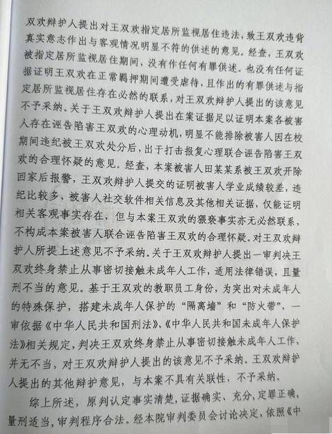 澎湃新闻此前报道,6名指控王双欢的女生,都曾因违纪等被王双欢处理,或被开除回家,或曾被停课。6名女生指控称,她们在校内教室走廊、教室后门、会议室、办公室等地遭到王双欢猥亵。