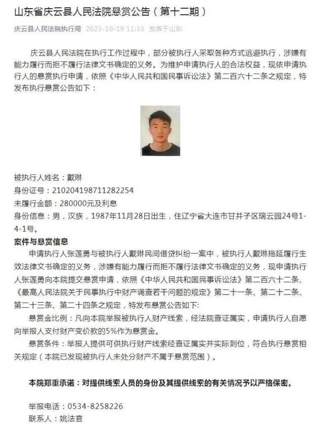 10月19日,山东省庆云县人民法院发布对前山东泰山球员戴琳悬赏公告。悬赏公告显示,被执行人戴琳未履行金额为28万元人民币以及利息。