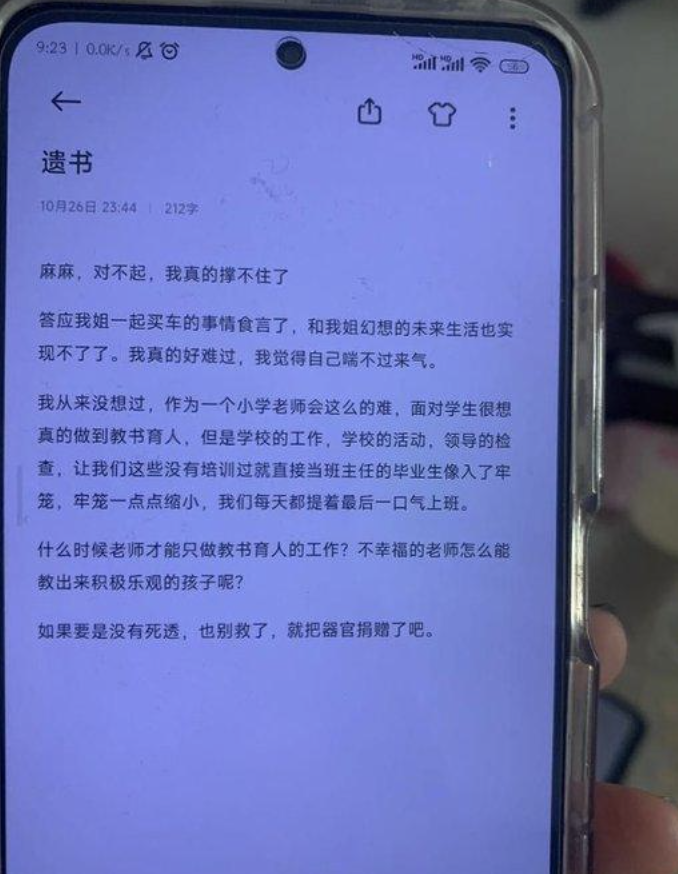 23岁小学女教师自杀,留遗书称课外工作压力大。
