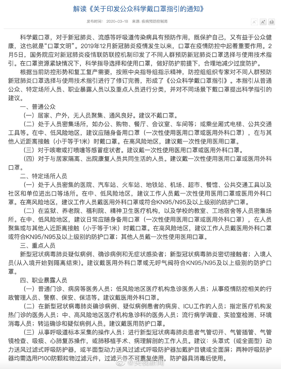 国家卫健委印发公众科学戴口罩指引:居家户外无人员聚集可不戴口罩。普通公众居家、户外,无人员聚集、通风良好,建议不戴口罩;处于人员密集场所,在中、低风险地区,建议应随身备用口罩,在与其他人近距离接触(小于等于1米)时戴口罩;在高风险地区,建议戴一次性使用医用口罩。