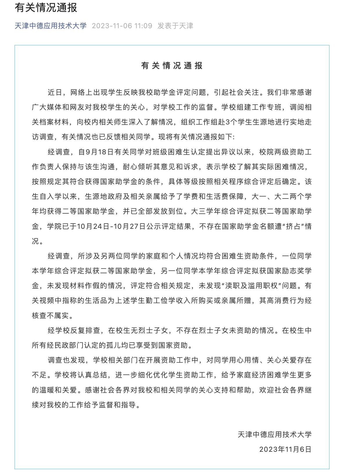 11月6日,天津中德应用技术大学通报,近日,网络上出现学生反映该校助学金评定问题,引起社会关注。现将有关情况通报如下: