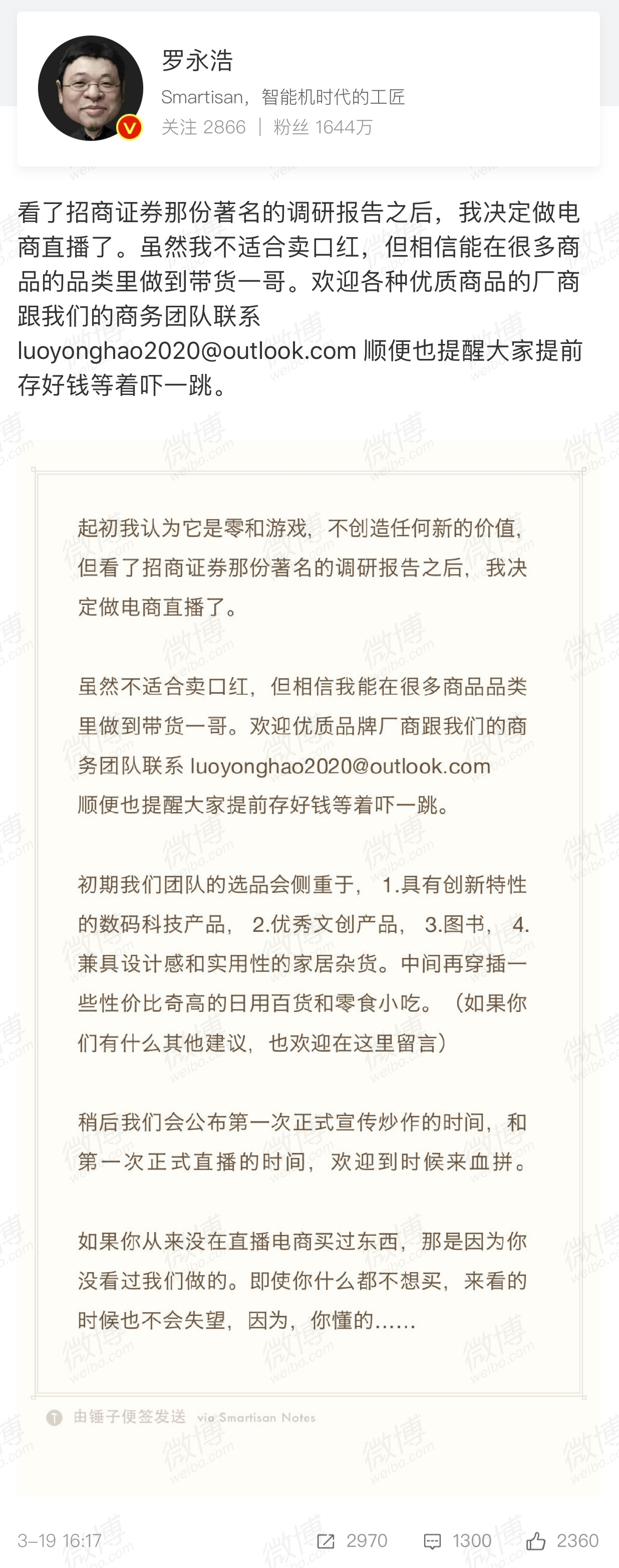 罗永浩宣布进军电商直播:要做带货一哥。