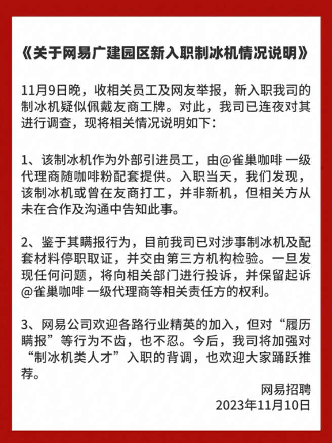 据悉,网易进行举报的源头是近期在网络上引发很多争议的“网易制冰机是腾讯二手的”事件。11月8日,雀巢一级代理商运输一批制冰机至网易广建园区。11月9日,网易员工反馈,该制冰机贴有第三方公司的明显使用标签,疑似为二手机器。11月9日晚,在收到相关反馈后,网易立即对相关二手制冰机及雀巢咖啡豆、奶粉等进行封存、检测。