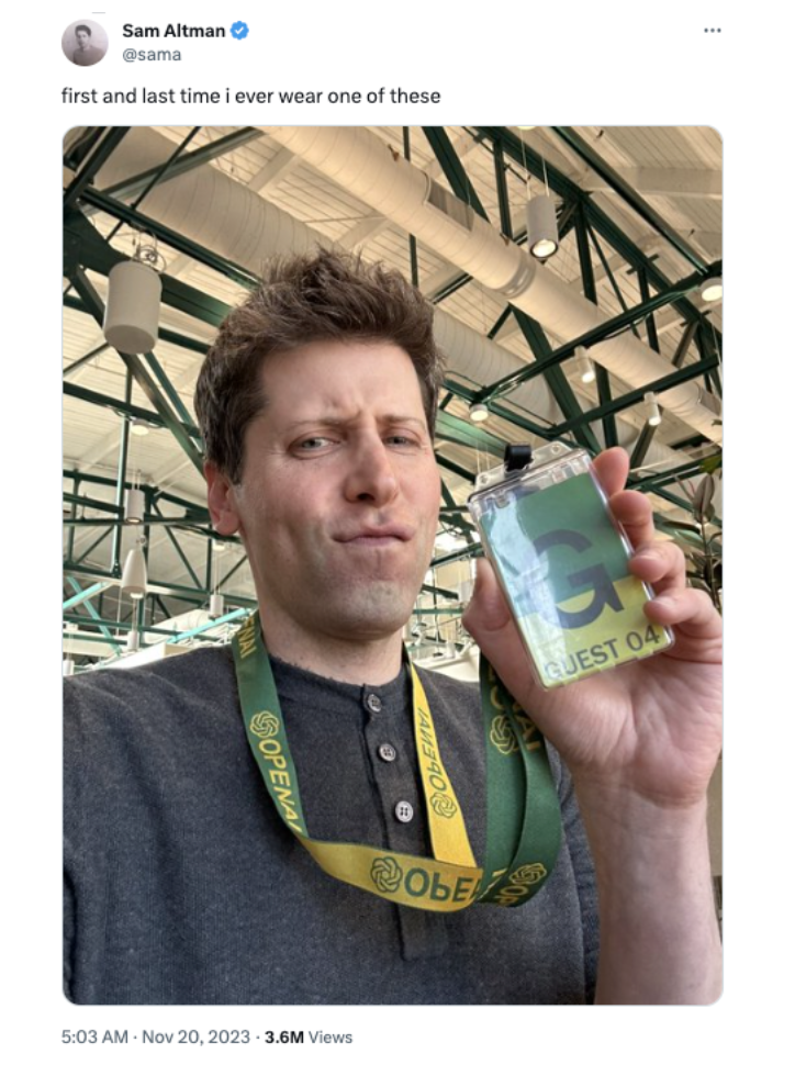 山姆·奥特曼以访客身份现身OpenAI总部。北京时间11月20日5时许,OpenAI前首席执行官山姆·奥特曼(Sam Altman)在社交平台X发文称,“这是我第一次也是最后一次戴这个。”配图是他佩戴着OpenAI的访客工牌,出现在旧金山总部。据多家美媒报道,OpenAI的投资者正向公司董事会施压,要求董事会撤销罢免前CEO山姆·奥特曼并解除其董事职务的决定。