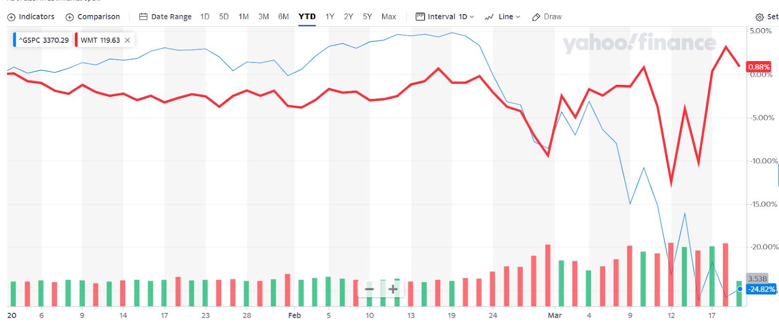 尽管标普指数迄今已下跌近25%,但沃尔玛上涨了近1%,分析师认为这不足为奇,因为在市场低迷时期沃尔玛的表现通常好于许多股票,上次在金融危机期间也存在类似的情况。