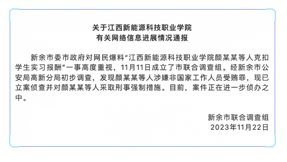 官方再通报“江西一职业院校克扣学生巨额实习报酬”事件:颜某某等人被采取刑事强制措施。“新余发布”官微消息,新余市联合调查组通报,新余市委市政府对网民爆料“江西新能源科技职业学院颜某某等人克扣学生实习报酬”一事高度重视,11月11日成立了市联合调查组。经新余市公安局高新分局初步调查,发现颜某某等人涉嫌非国家工作人员受贿罪,现已立案侦查并对颜某某等人采取刑事强制措施。目前,案件正在进一步侦办之中。
