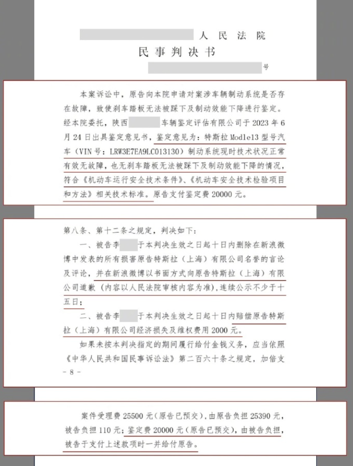 据中国新闻周刊,11月27日,近日,特斯拉诉“上海车展事件”车主名誉权侵权一案,法院作出一审判决,认定西安李女士名誉侵权责任成立,须向特斯拉公开赔礼道歉并赔偿2000元,同时承担2万元车辆鉴定费。经鉴定,涉案车辆不存在刹车问题。