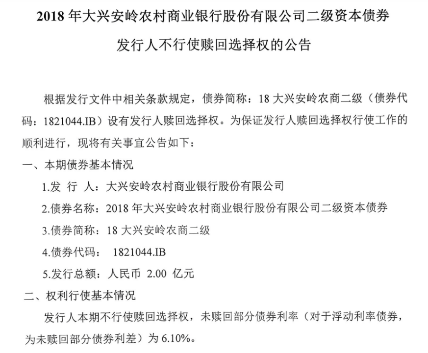12月1日,大兴安岭农商行发布公告称,对于该行2018年二级资本债券不行使赎回选择权,债券规模为2亿元。未赎回部分债券利率(对于浮动利率债券为未赎回部分债券利差)为6.10%。