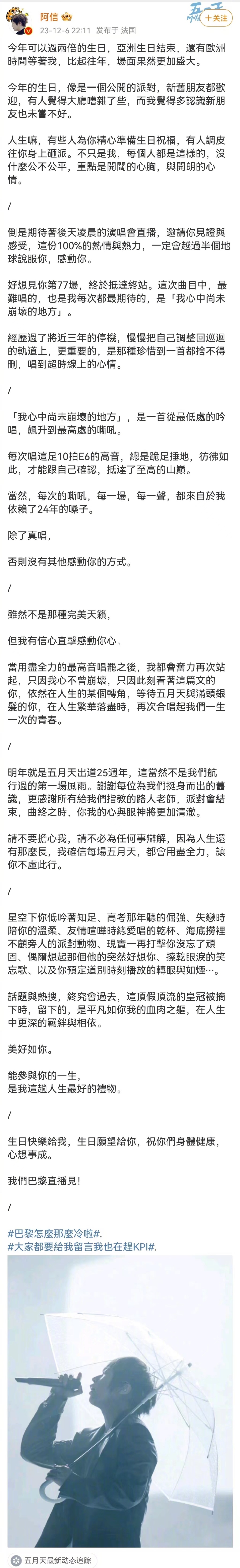 12月6日,阿信微博发长文回应假唱风波:每次的嘶吼,每一场,每一声,都来自于我依赖了24年的嗓子。除了真唱,否则没有其他感动你的方式。